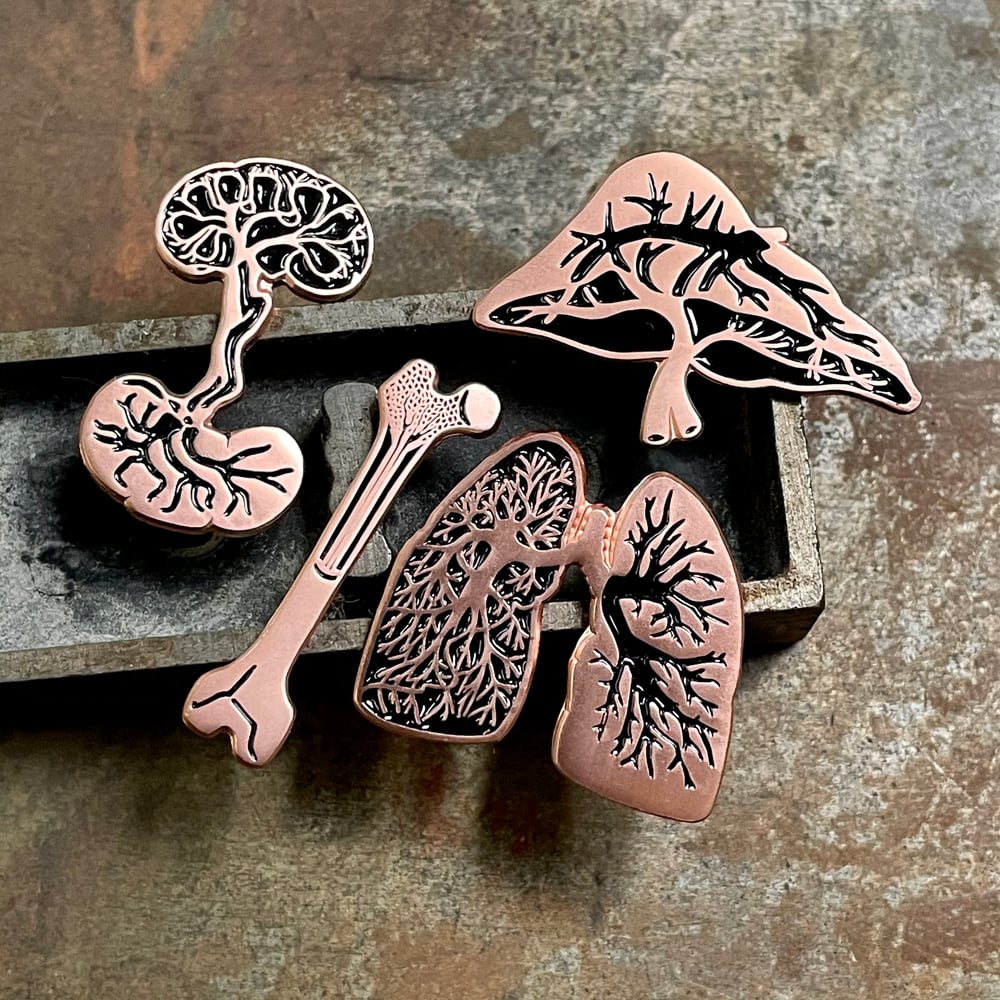Our bone marrow design started as a paper cutout of anatomical human femur and its interior before being made into this copper and black enamel pin. This is the fifth in our series of body part pins for the Chop Shop, a collaborative project between Mary Toscano and Elpitha Tsoutsounakis exploring human organ and tissue transplants.