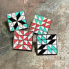 3/4-inch quilt block cloisonné pin in silver metal with pink, red, grey, and magic mint enamel.